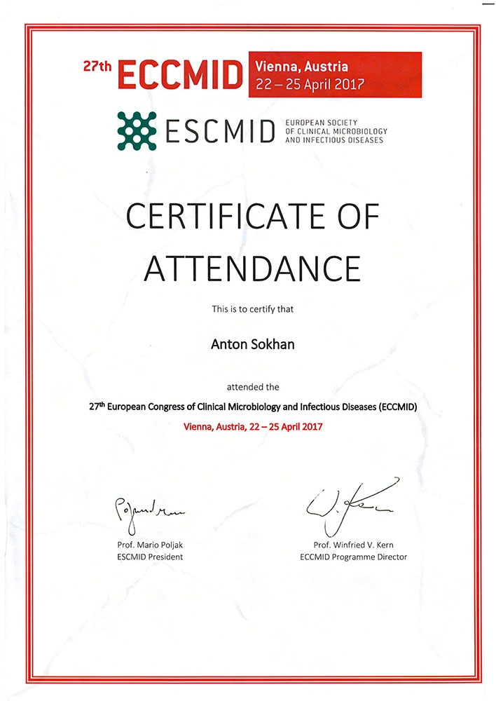 • Учасник Європейського конгресу клінічної мікробіології та інфекційних захворювань у 2017 році (ECCMID 2017), Відень, Австрія.