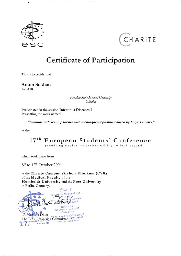 • Учасник 17-ма Європейська медична конференція Шаріте, Берлін, Германия 2006 р.
