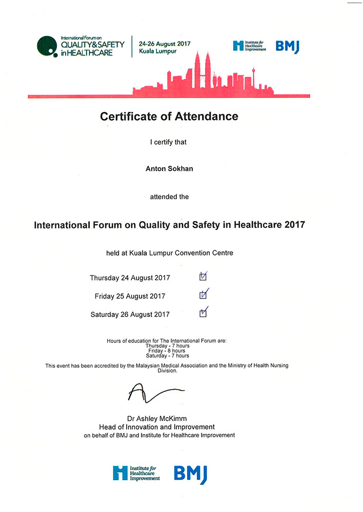 • Міжнародний форум «якість і безпеку в охороні здоров’я», Малайзія, Куала Лумпур, 24-26 серпня 2017.